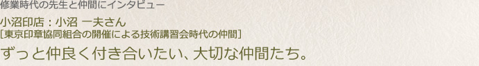 私が技術講習会に参加した時は、社会人経験を経た分、みんなより年上で20代後半だったんです。でも年齢差はあまり関係なく、同じ目標に向かう仲間として仲良くやれていましたね。それぞれが実力をつけて、印章の世界で「こうもしよう、ああできたらいい」と夢や想いも語り合っていた時期。みんな一生懸命で、今思うと、とても充実していましたね。その中でもナメちゃんは特に情熱を秘めていた印象があります。