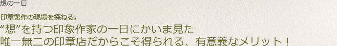 「実印等をお買い上げいただいたお客様に、彫刻名・文字解説(成立・意味)を記した、スタンプナメカワ流の彫刻証明書を附随進呈させていただきます。自分自身の名に刻まれたルーツを知るうえで、貴重な知識を得ることができるのです」